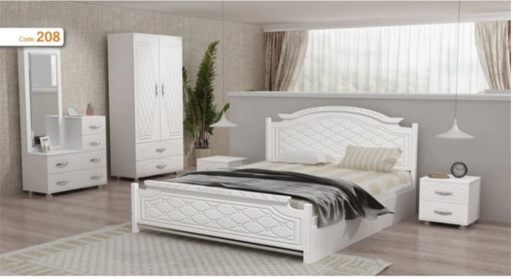 جنس کشوها و پاتختی و میز آرایش نیز از نئوپان با روکش ملامینه بوده و کمد ترکیبی از MDF و نئوپان است.